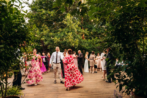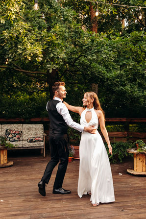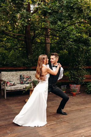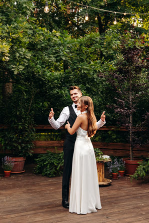 Na ten wyjątkowy moment Emilia i Marcin wybrali ponownie drewniane patio. Zachodzące słońce stworzyło niepowtarzalną atmosferę. Utworem do pierwszego tańca była piosenka Taylor Swift „Lover”. To jeden z najczęściej wybieranych kawałków na pierwszy taniec, jednak trudno się temu dziwić - romantyczny tekst i piękna melodia robią swoje. Po układzie tanecznym Nowożeńców goście pozostali jeszcze na plenerowym parkiecie na jeden set muzyczny, a my wykorzystaliśmy ten czas na mini sesję Młodej Pary. Chcieliśmy uchwycić ostatnie promienie słońca, dlatego wybraliśmy się na krótki fotograficzny spacer po terenie Cichej 23. Kadry powstawały niemal same - Emilia i Marcin przed naszymi obiektywami zachowywali się bardzo naturalnie i swobodnie, nie szczędząc sobie czułości, co widać na zdjęciach. Moglibyśmy fotografować ich jeszcze długo, jednak światło słoneczne powoli znikało, a goście nie powinni zostawać sami zbyt długo.