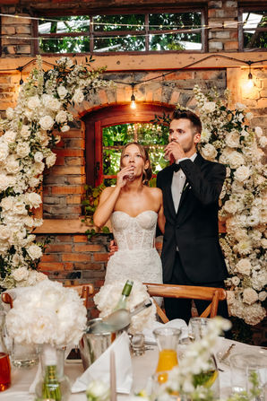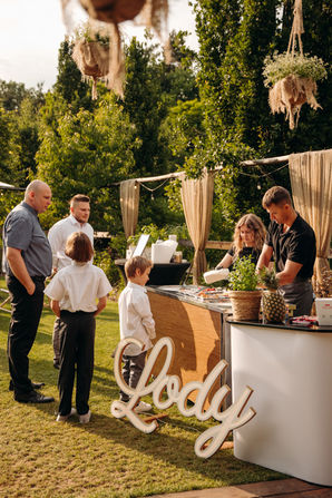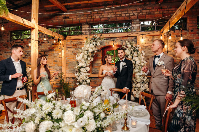 Po ceremonii goście przeszli za Nowożeńcami na drewniane patio, gdzie odbył się pierwszy toast szampanem, a następnie był czas na życzenia i zdjęcia pamiątkowe. Później wszyscy udali się na salę, gdzie odbyło się powitanie Młodej Pary. Był to moment uroczystej kolacji, krótkich przemówień oraz integracji gości. W tym czasie ruszyły także dodatkowe atrakcje przygotowane przez Parę Młodą - plenerowe stoisko z lodami tajskimi, bar ze specjalną kartą drinków oraz bajkowe animacje dla najmłodszych. Młodzi mieli również chwilę, aby odpocząć i przygotować się do swojego pierwszego tańca jako małżeństwo.