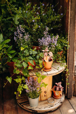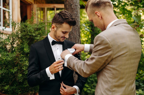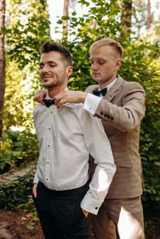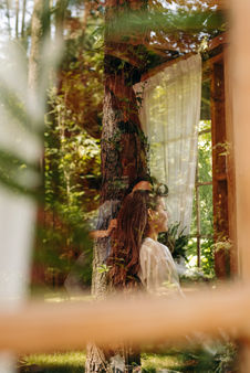 Kiedy nadszedł odpowiedni moment, zajęliśmy się fotografowaniem przygotowań Pana Młodego. Wyszliśmy do ogrodu przy drewnianym domku Nowożeńców. Ciepłe światło słoneczne idealnie współgrało z otaczającą nas zielenią, dzięki czemu zdjęcia nabrały wyjątkowego charakteru - eleganckiego, podkreślonego formalnymi strojami panów, ale jednocześnie naturalnego i harmonijnego z przyrodą. Po kilku portretach Pana Młodego przeszliśmy do domku, gdzie uwieczniliśmy ekipę dziewczyn wznoszących toast winem musującym. Gdy wszyscy nieco się rozluźnili, przyszedł czas na przygotowania przyszłej Panny Młodej. Emilia zdecydowała się szykować w środku, aby Marcin nie zobaczył jej przed first lookiem. W ubieraniu towarzyszyły jej mama oraz najlepsza przyjaciółka, dzięki czemu przygotowania przebiegły sprawnie i w spokojnej atmosferze.